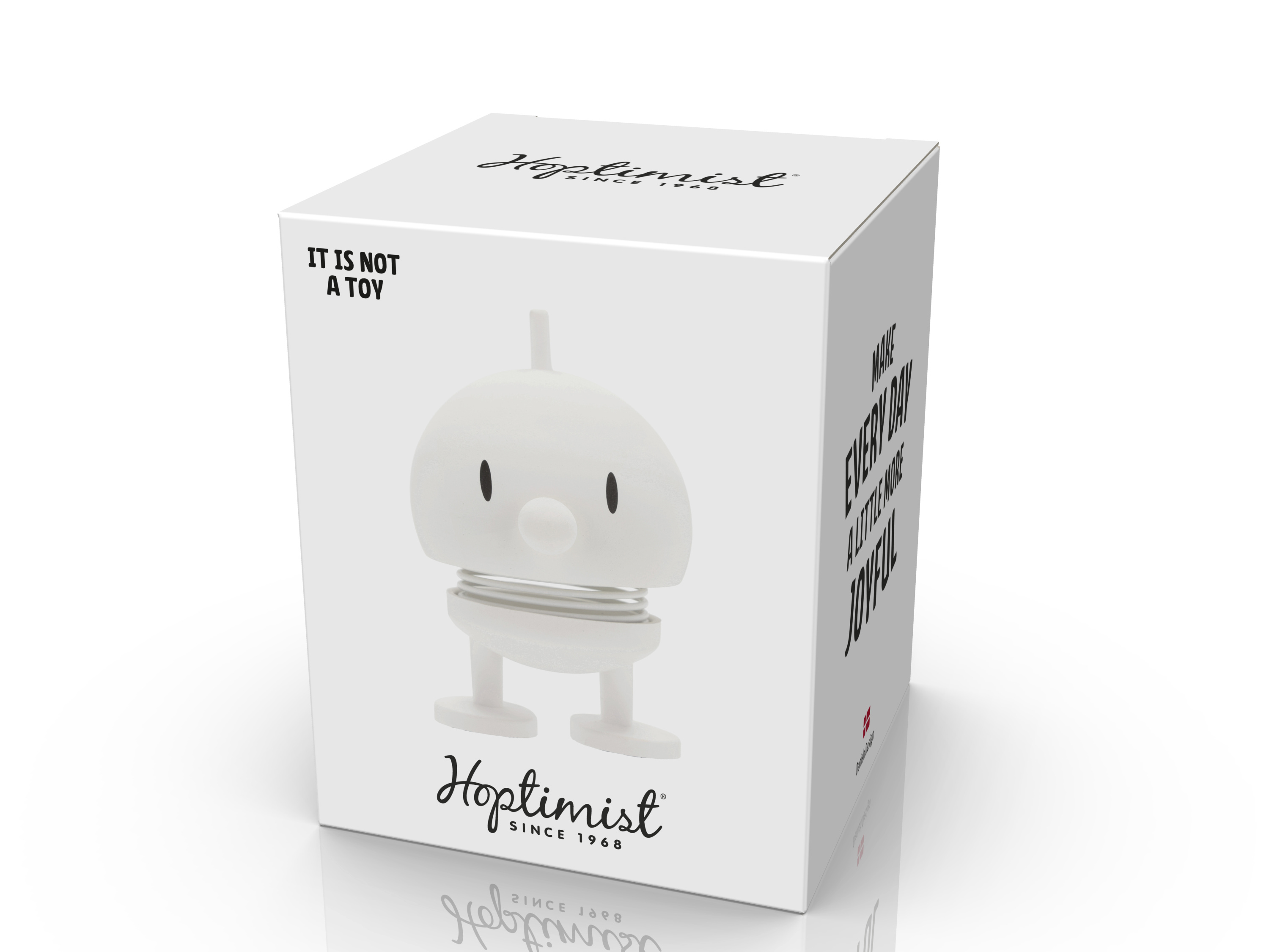 · Mit einem starken Glauben an die Kraft des Lächelns schuf Gustav Ehrenreich Ende der 1960er Jahre seine fröhliche Hoptimisten-Bewegung. Das Ziel war es, eine Figur zu schaffen, die eine ewige Erinnerung daran bilden sollte, positiv und optimistisch zu bleiben. Denn obwohl die 60er Jahre oft als The Happy 60ies bezeichnet werden, war das Jahrzehnt von Unruhen geprägt. Daher war Ehrenreichs Design ein gern gesehener Freudenspender in einer in einer ansonsten eher turbulenten Zeit. Bimble und Bumble repräsentieren die allerersten Hoptimisten aus der Hand des Designers: Ein für die Schule gekleidetes Mädchen mit lächelnden Augen und ein aufmerksamer Junge mit einem Splint auf dem Kopf. Die fröhlichen Hoptimisten sind heute ein Teil der dänischen Designgeschichte und sorgen weltweit für Freude. Die Figuren sind in vier verschiedenen Größen und in einer breiten Farbpalette erhältlich, die jede Menge Energie, gute Laune und Freud verbreiten.Es gibt garantiert einen Hoptimisten für jeden Anlass und für jede Person.