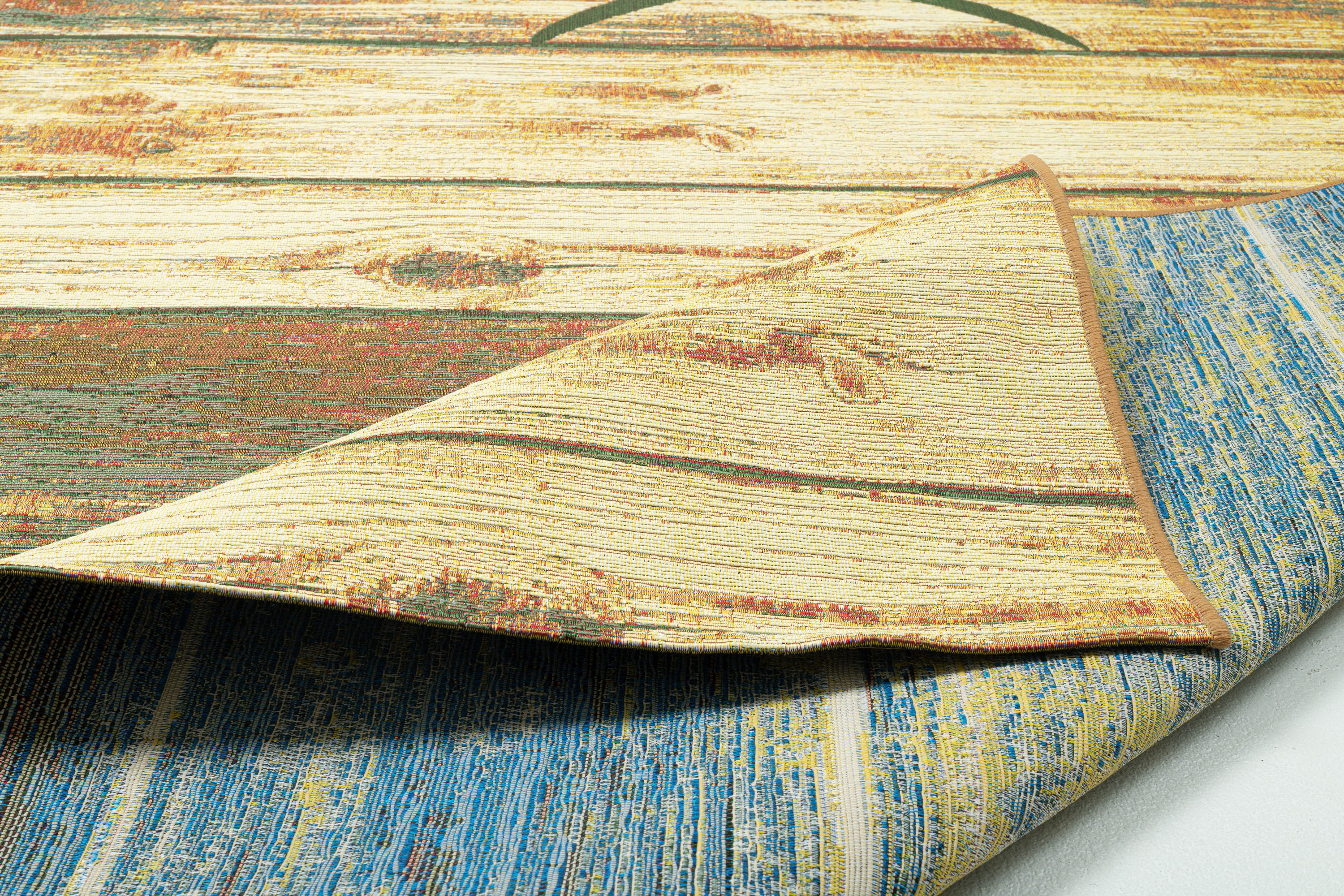 · RANTUM-BEACH - Outdoor / Indoor Teppich der Extraklasse -der gute Laune Teppich für draußen und drinnen Der Artikel RANTUM-BEACH aus der SANSIBAR Kollektion ist ein topaktueller, sehr strapazierfähiger, Outdoor/Indoor-Teppich mit einer farbenfrohen lebensbejahenden Designsprache. Er bringt das berühmte SANSIBAR- Feeling (die Holzhütte am Strand), den herrlichen Nordseestrand mit seinen kreischenden Möwen, das komplette Syltflair (“Urlaub, Freizeit und Glück“) auf Ihre Terrasse, in Ihren Garten, in Ihr Wohn-und Esszimmer. Selbst als Küchen- oder Kinderzimmerteppich eignet sich diese robuste Qualität. Beachten Sie auch die Größe 100 x 200 cm, der ideale Strandteppich. Ein “gute Laune Teppich“ für alle Lebensräume! Hergestellt aus hochwertigem schadstoffgeprüftem Polypropylen und Polyester Fasern hält dieses kurze Flachgewebe auch der größten Beanspruchung stand und erfreut Sie jahrelang mit einem makellosen Aussehen. Die verwendeten sehr widerstandsfähigen Synthetik Fasern bringen noch weitere hervorragende Nutzungseigenschaften mit sich, wie die Feuchtigkeits- und UV-Strahlen Resistenz. Diese Kombination von Material und Nutzungseigenschaften macht diesen Teppich zu einem einzigartigen Allrounder in ihrem Innen- und Outdoor- Wohnbereich. Die meisten Flecken lassen sich leicht mit einem feuchten Tuch entfernen und bei hartnäckigen Flecken greifen Sie einfach zu einem handelsüblichen Teppichschaum. Das verarbeitete Material trocknet bei Nässe schnell wieder aus, ohne sich zu verfärben oder gar abzufärben, was selbstverständlich für die Farbechtheit dieses Produktes steht. Auch in Räumen mit Fußbodenheizung kann dieser Teppich problemlos ausgelegt werden.