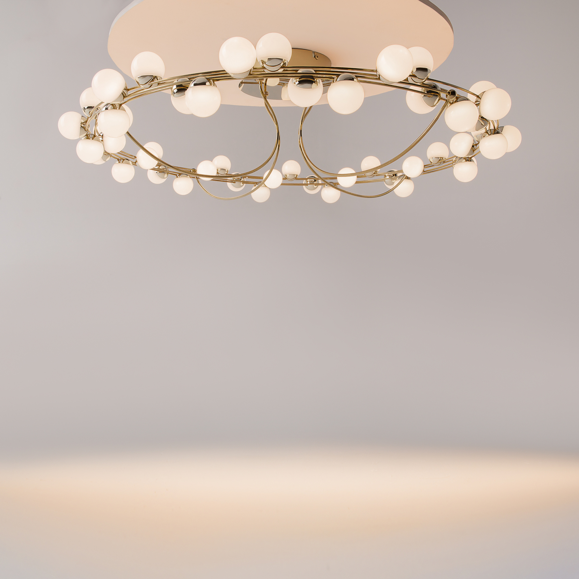 · Metallbeschläge in Gold. Kugelförmige Lampenschirme aus weißem Kunststoff. Design mit Nachahmung der Molekularstruktur. LED-Lichtquellen.