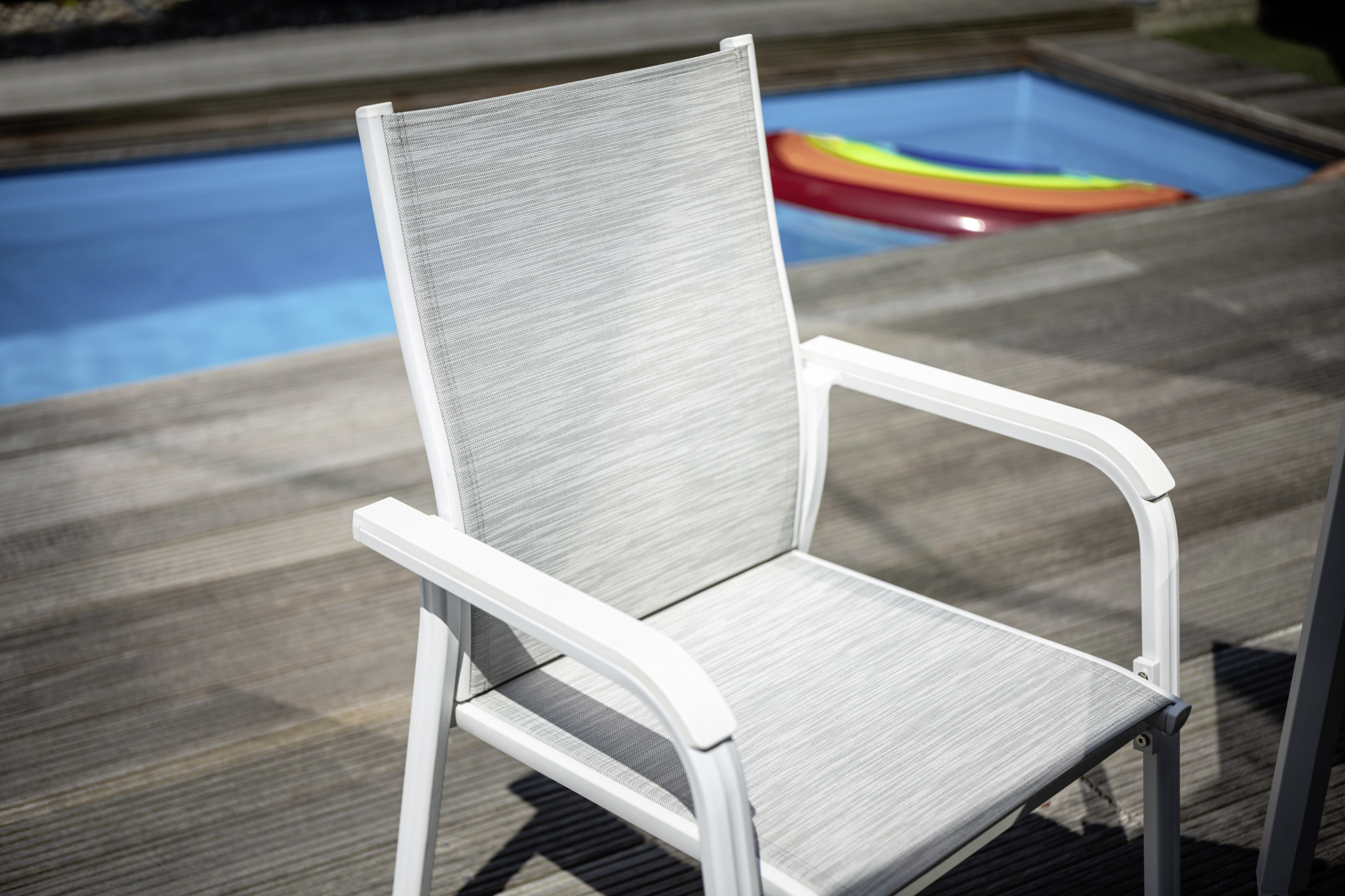 · weiß matt, hellgrau · Aluminium, Outdoorgewebe · Sitzbreite: 49cm · Sitztiefe: 68,5cm ·... mehr