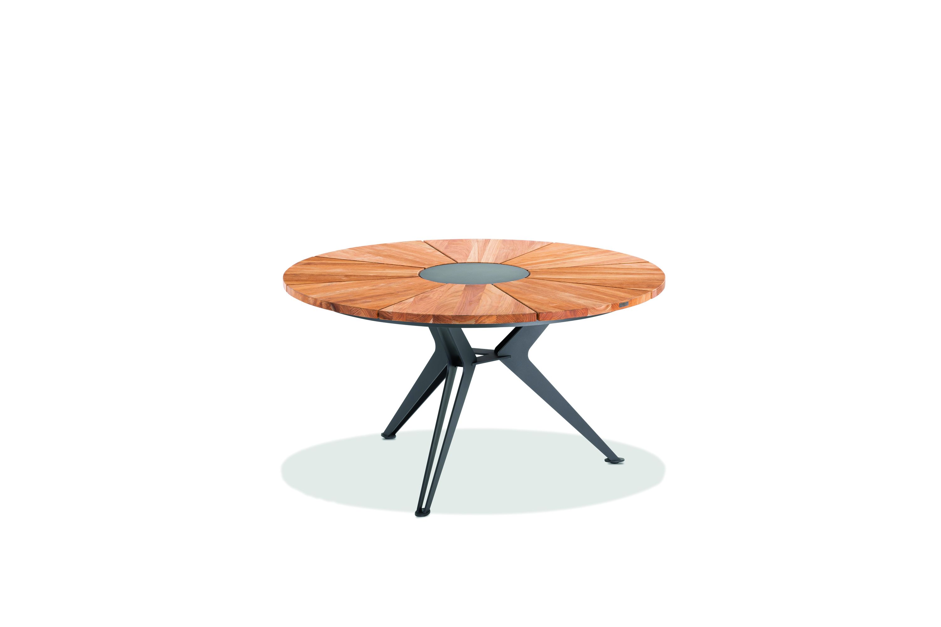 · Tisch NEXOR Tischplatte Teak geölt, Mitteleinlage Stahl pulverbeschichtet, Farbton anthrazit, 3-Fuss Stern Gestell Stahl feuerverzinkt pulverbeschichtet, Farbton anthrazit, 140 / 76 cm