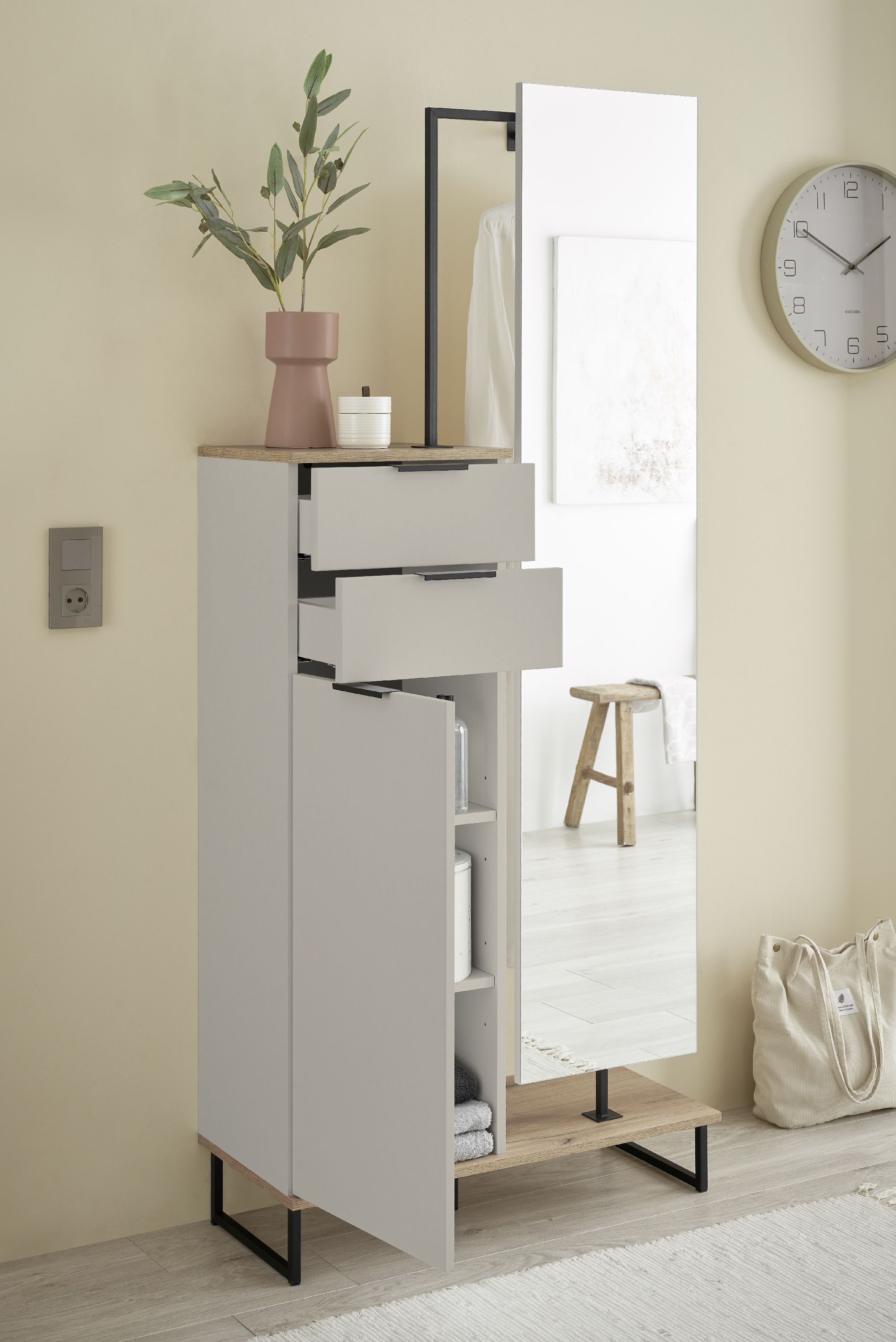 · ein Spiegel, eine Kleiderstange, Split