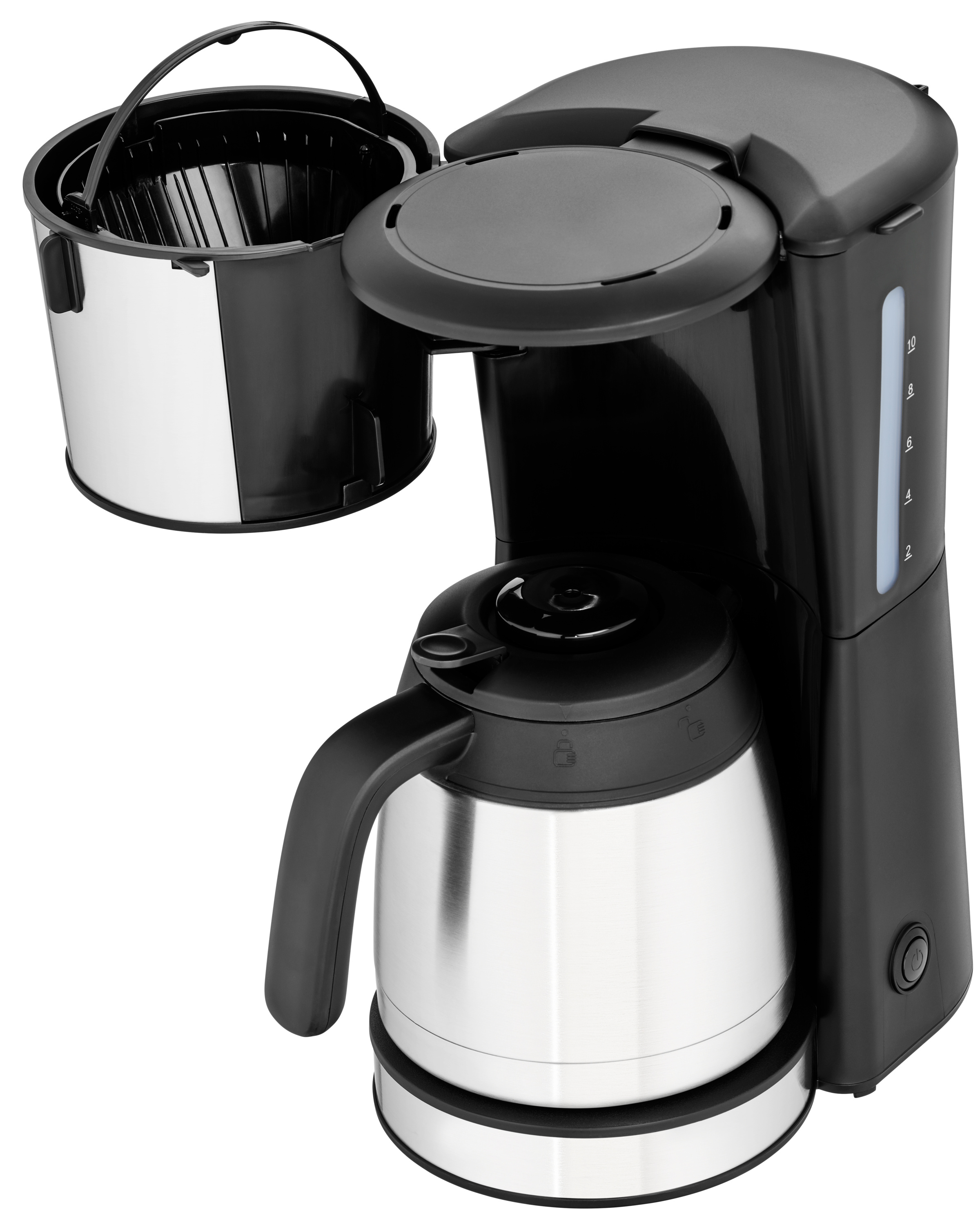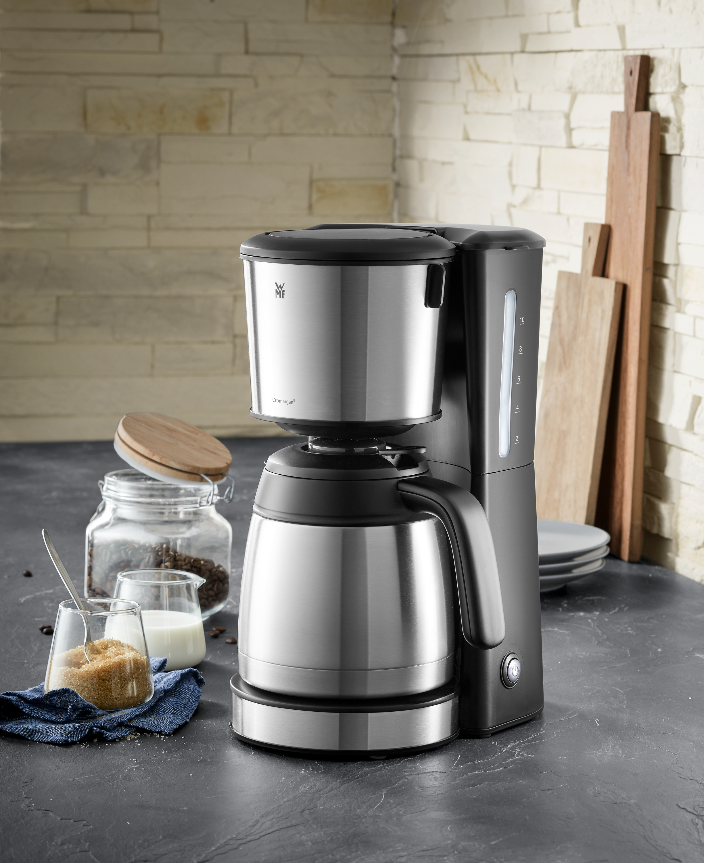 · Filter-Kaffeemaschine mit Thermokanne und intelligenten Funktionen Durch ihr schlicht-elegantes Design mit einem hochwertigen, matten Cromargan® Gehäuse fügt sich die WMF Bueno Pro Kaffeemaschine Thermo nahtlos in jedes Küchenambiente ein. Dank cleverer Funktionen ist sie komfortabel und einfach zu bedienen: Die externe Wasserstandsanzeige und der Schwenkfilter sorgen dabei für eine mühelose Kaffeezubereitung. Die hochwertige Thermokanne fasst bis zu zehn Tassen Kaffee, bewahrt das volle Aroma und hält heißen Kaffee stundenlang auf optimaler Temperatur für puren Kaffeegenuss. Einfach die Ein-/Ausschalttaste mit Kontrollleuchte drücken und jedes Mal perfekt aufgebrühten Kaffee genießen. Bei der WMF Bueno Pro Kaffeemaschine Thermo verbindet sich elegantes Design mit außergewöhnlicher Langlebigkeit: Das robuste Cromargan® Gehäuse mit mattem Oberflächenfinish beeindruckt jedes Mal aufs Neue durch seine edle Ästhetik.