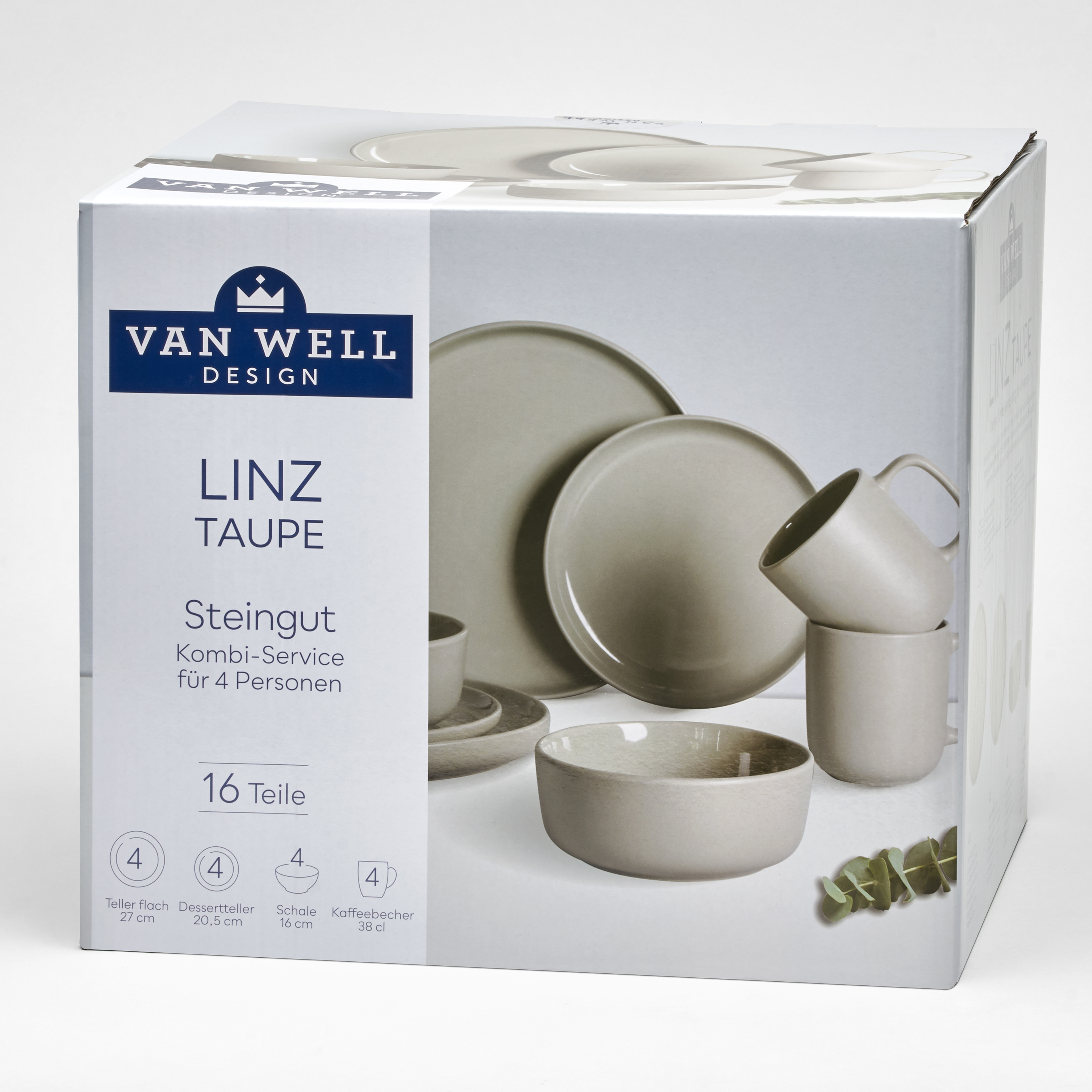 · 16 teilig bestehend aus: 4 Kaffeebecher 380 ml 4 Dessertteller 20,5 cm 4 Speiseteller 27 cm 4 Müslischale 16 cm