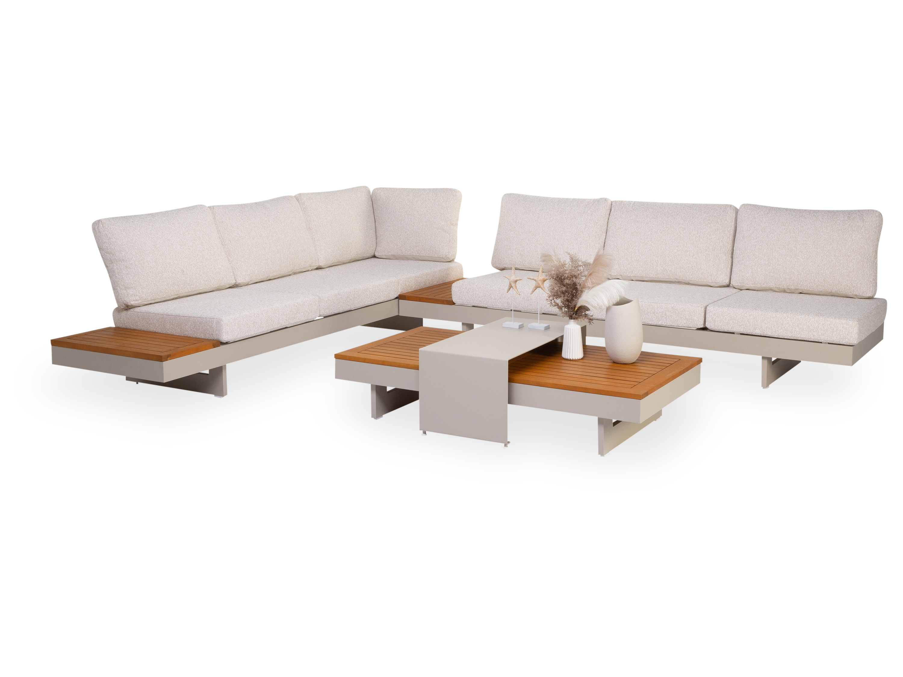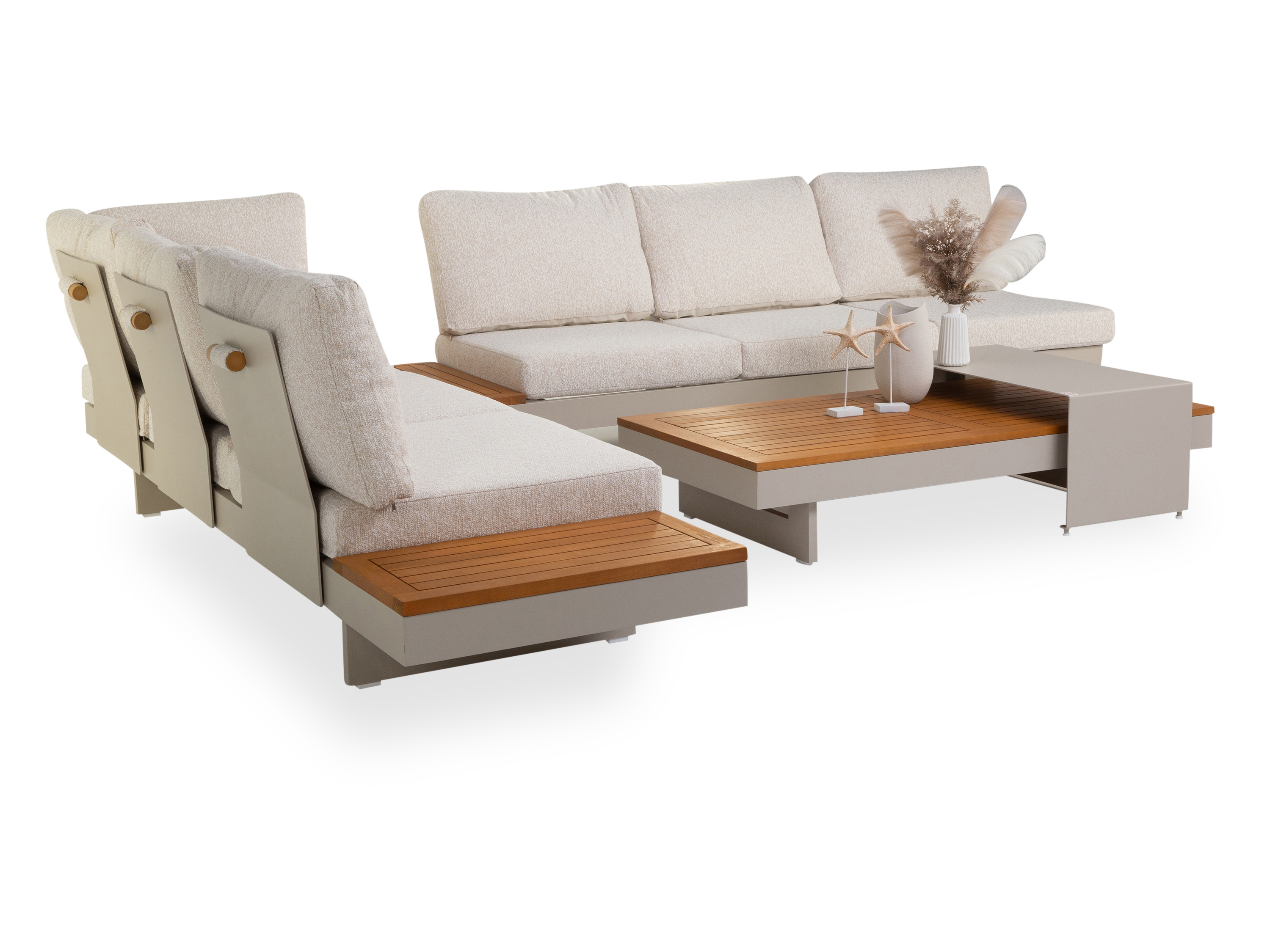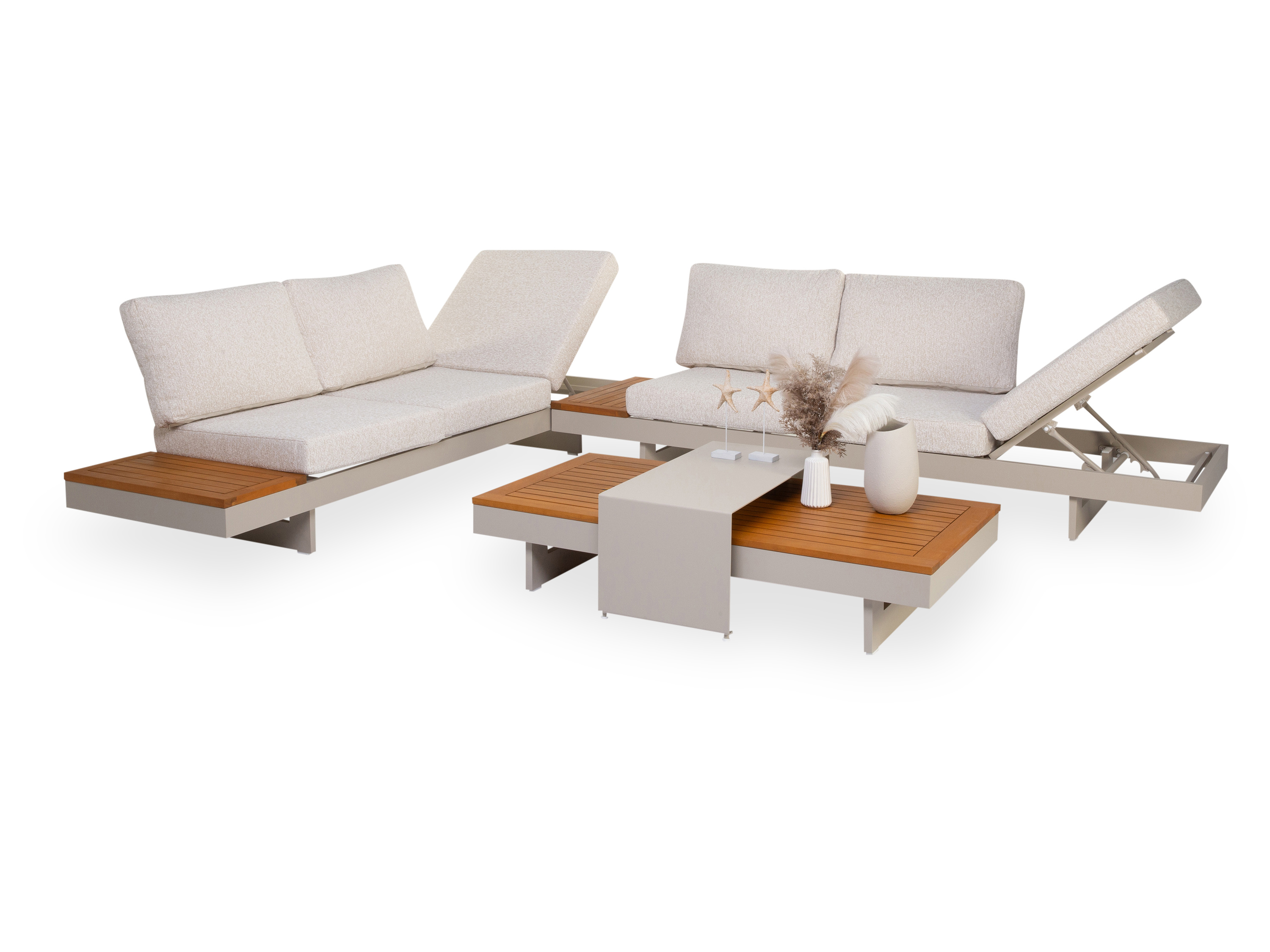 · zwei 3er Sofa, BHT 245x70x78 cm mit verstellbarer Rückenlehne und beweglichem Tisch 70x35 cm mit FSC Akazienholzlatten