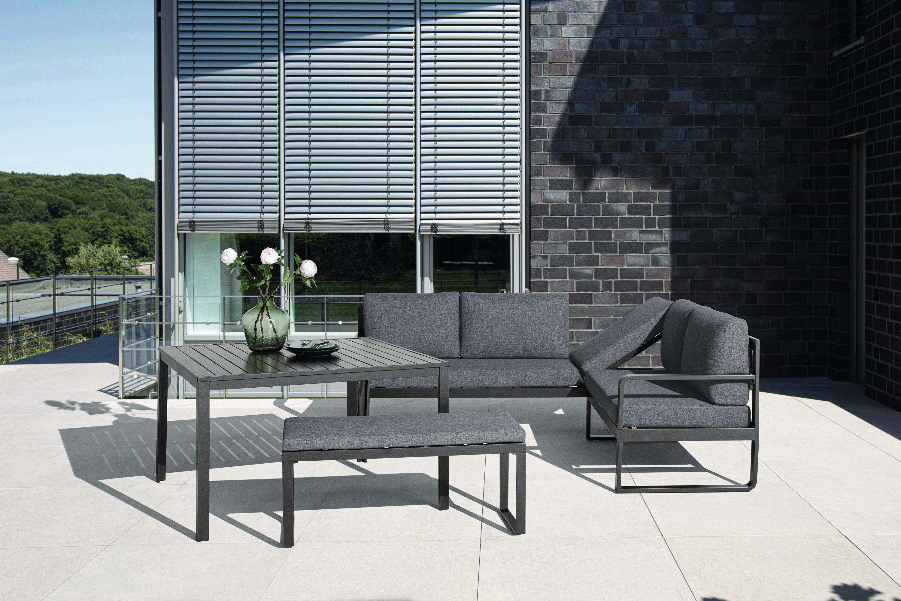 · Platz nehmen, Augen schließen und vom letzten Urlaub träumen! Durch das verstellbare Eckelement lässt sich das Ocean-Eckset sowohl zum Entspannen am Mittag, als auch zum gemeinsamen Essen optimal einsetzen.Das Set besteht aus 3-Sitzer links, 2-Sitzer rechts, Bank und Tisch inklusive formschöner Kissen in grau. Durch die einseitige Neigungsverstellung des Sitzes vom 3er-Sofa lässt sich die Mittagssonne noch besser genießen!