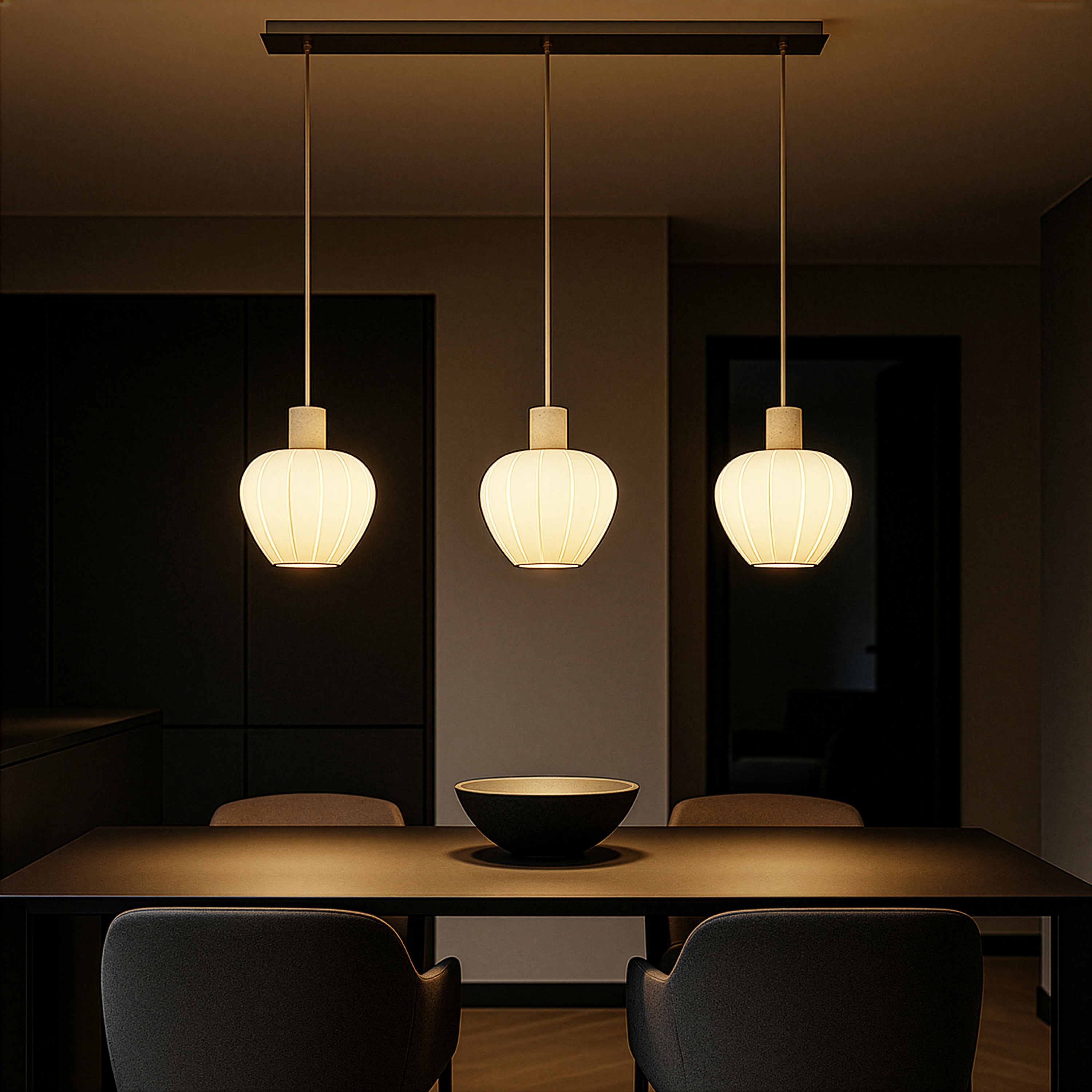 Funktionale Beleuchtung verbindet diese Pendelleuchte mit ansprechendem Design. Das hübsche Aussehen der Leuchte fügt sich perfekt in Ihren Wohnraum ein und spendet dabei schönes Licht für ein tolles Ambiente. Die Lampe ist insgesamt 100 cm breit, hat ein Tiefenmaß von 23,5 cm und ist 150 cm hoch. Sie ist an die Aufnahme von Leuchtmitteln mit E27-Sockel angepasst. Die Hängeleuchte schafft ein schönes Ambiente und kommt in jedem Wohnraum besonders gut zur Geltung. Die Hängeleuchte aus Glas ist eine dekorative Möglichkeit, Ihren Einrichtungsstil zu beleuchten, und somit eine tolle Wahl für Ihr Zuhause. Mit dieser Hängeleuchte können Sie das Erscheinungsbild Ihres Wohnraums weiter verschönern.