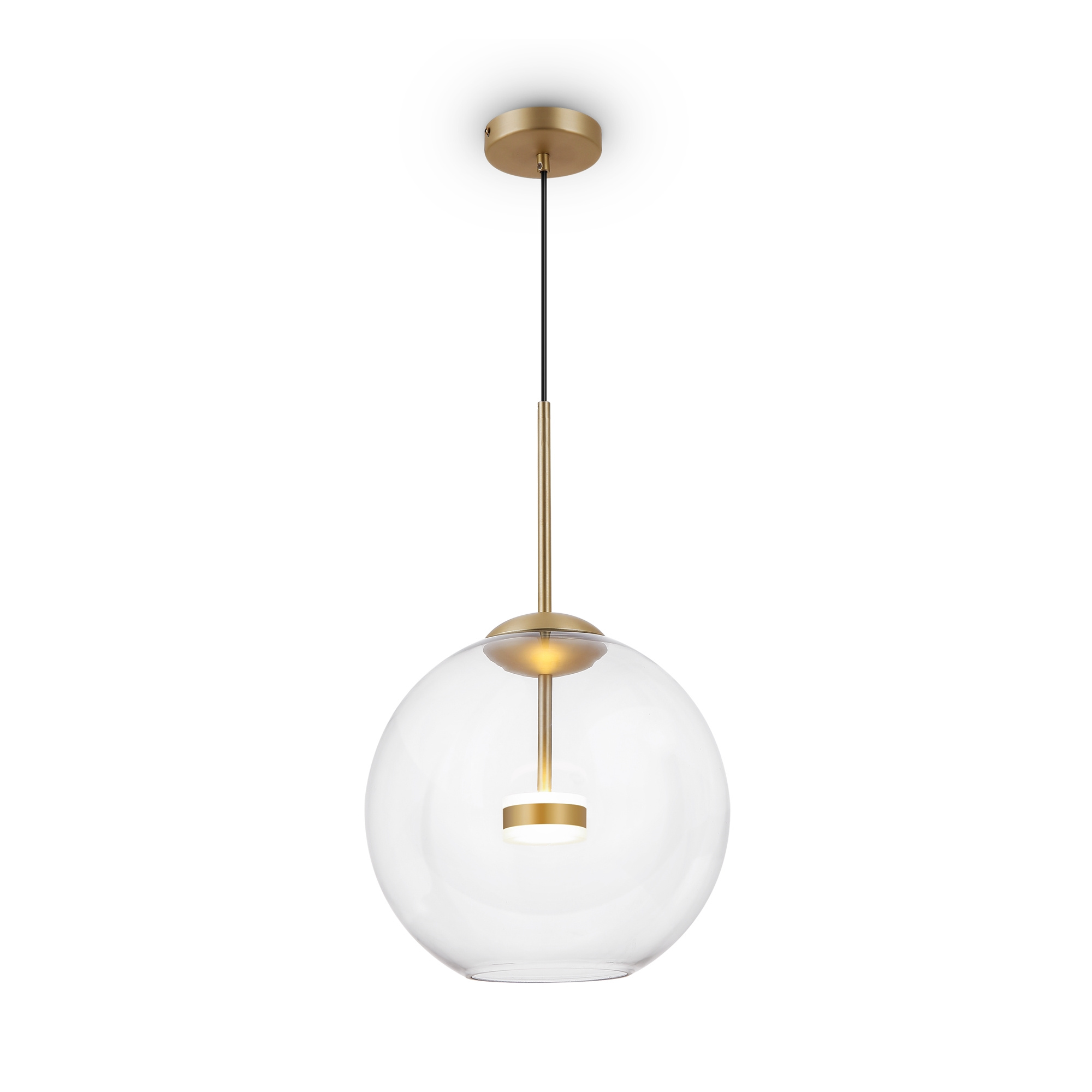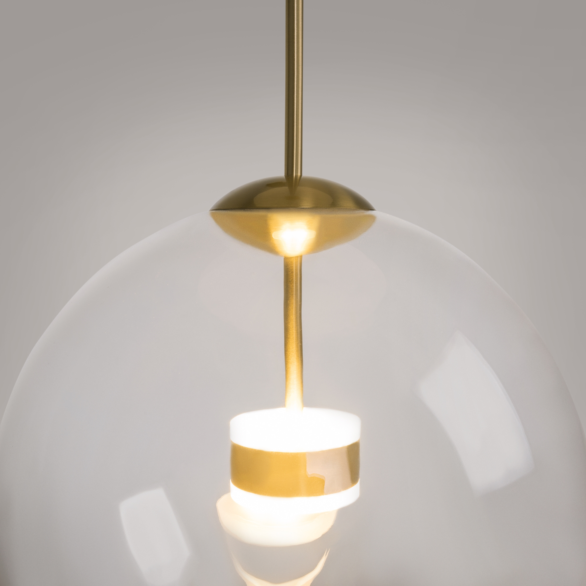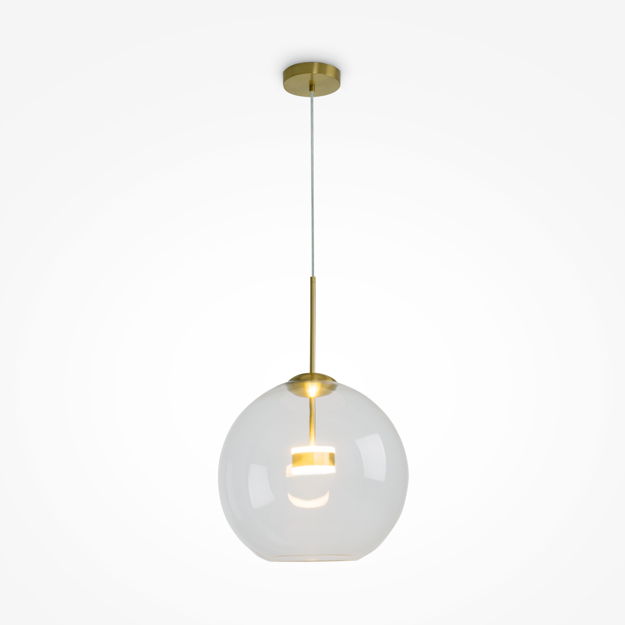 · Material der Beschläge: Metall, Farbton: Mattes Gold. Lampenschirm aus transparentem geblasenem Glas. LED-Lichtquelle. Einstellbare Höhe.