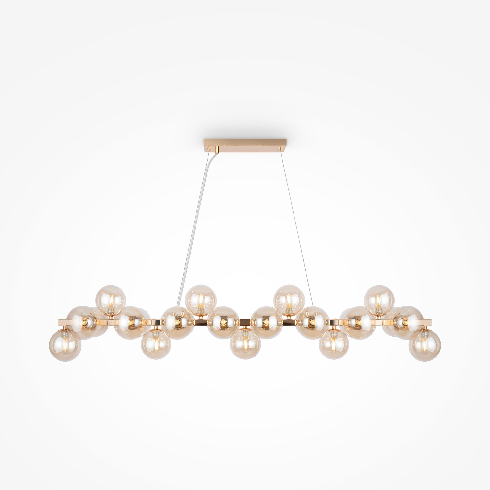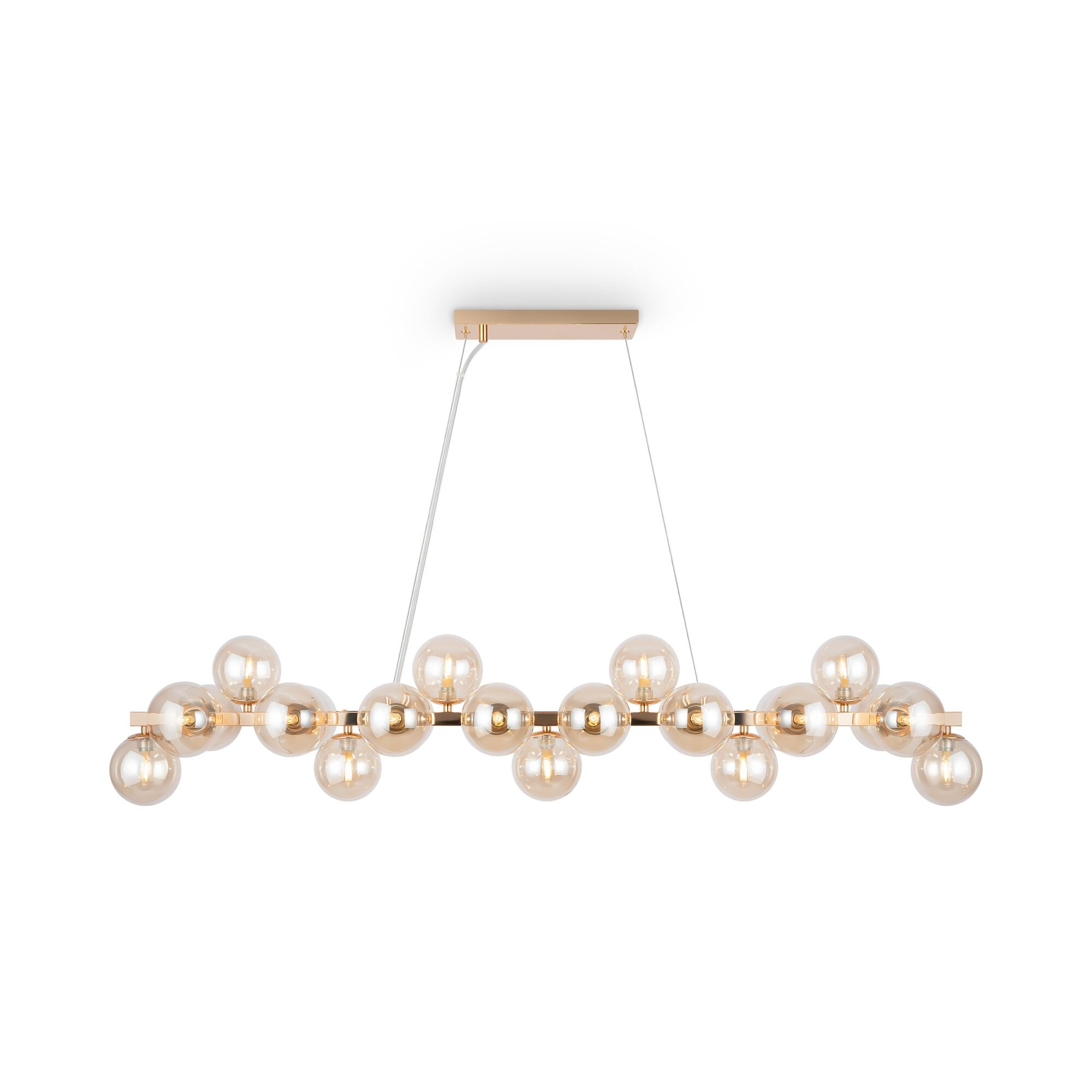 · Metallbeschläge in 4 Farbtönen: Mattes Schwarz, Schwarz, Chrom, Gold. Lampenschirme: Geblasenes Glas. Farbtöne: Rauch, Bernstein, Cognac, Mattes Weiß und Schwarz. Design mit Nachahmung der Molekularstruktur. Durch Seile einstellbare Höhe der Pendelleuchten. Leuchtmittel mit einer Fassung G9.