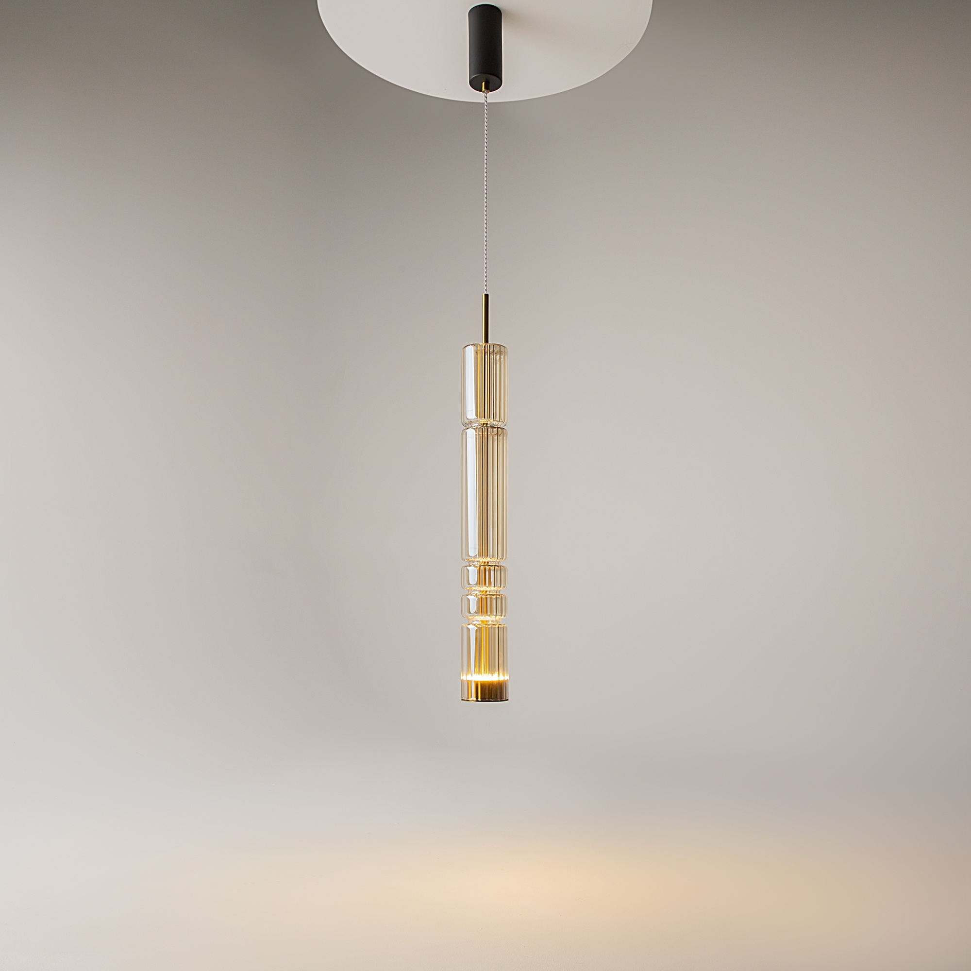 · Beschläge - Metall, Farbe - Chrom, Messing, Schwarz. Zylindrische Lampenschirme aus Glas mit vertikalem Reliefmuster in drei Farbtönen: transparent, Cognac, Rauch. Eine Metapher der antiken griechischen Tempelsäulen in Form von Leuchten. LED-Lichtquelle. Farbtemperatur 3000?.