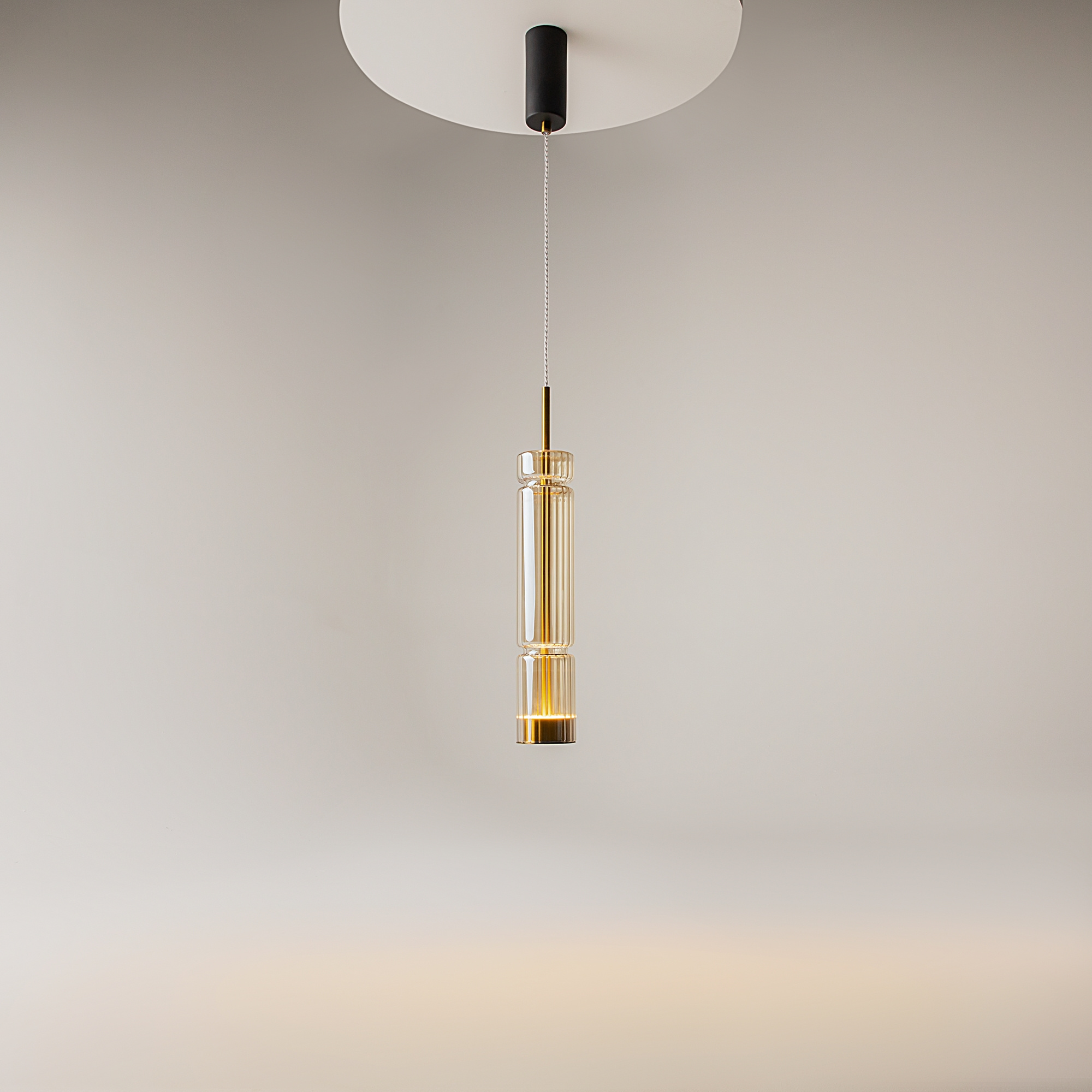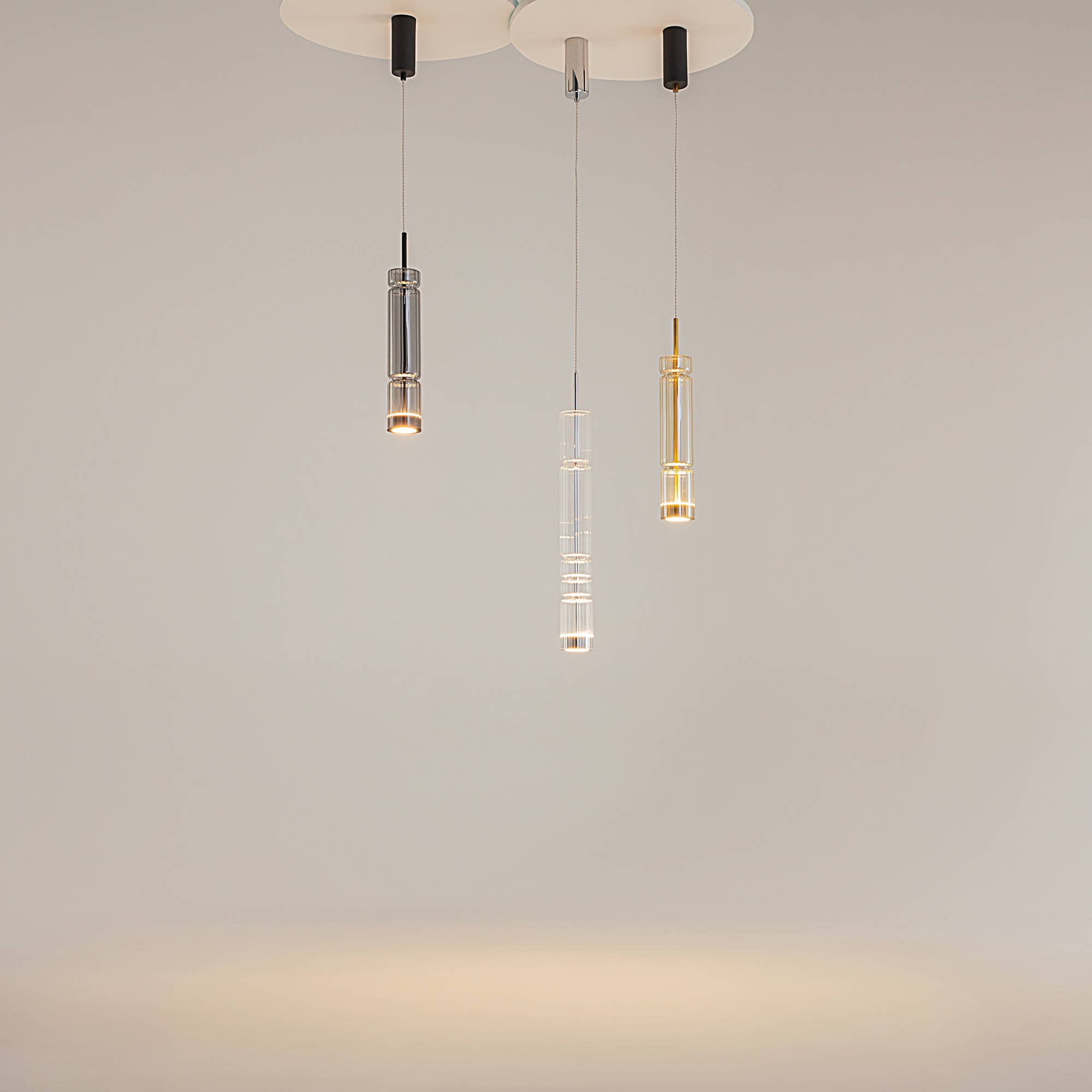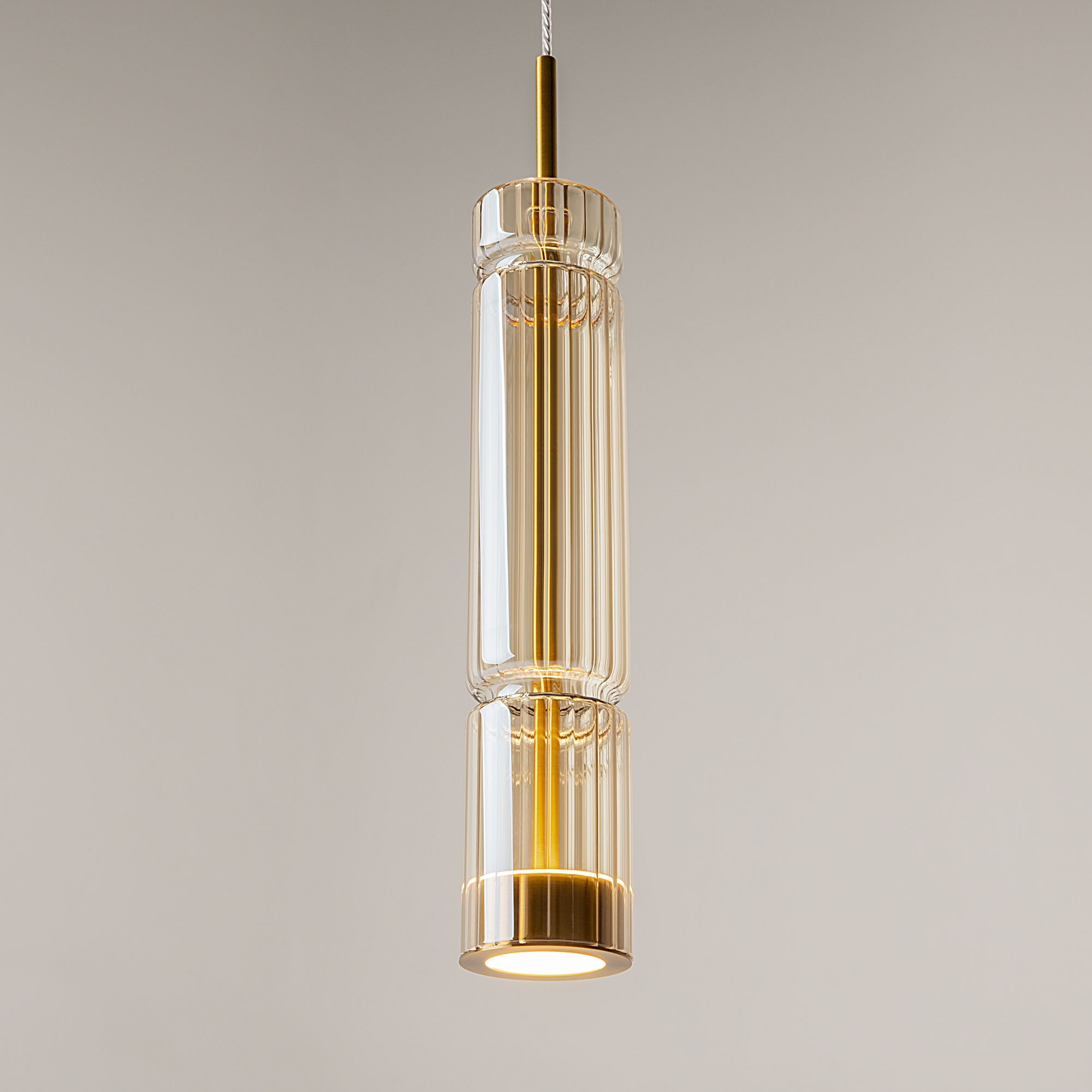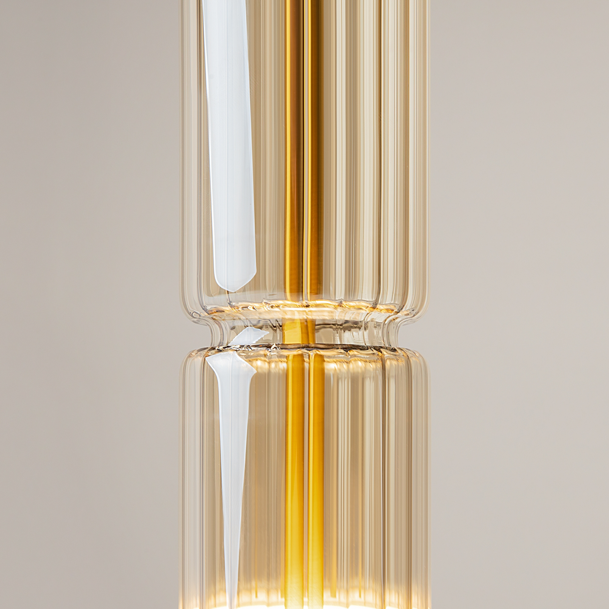 · Beschläge - Metall, Farbe - Chrom, Messing, Schwarz. Zylindrische Lampenschirme aus Glas mit vertikalem Reliefmuster in drei Farbtönen: transparent, Cognac, Rauch. Eine Metapher der antiken griechischen Tempelsäulen in Form von Leuchten. LED-Lichtquelle. Farbtemperatur 3000?.