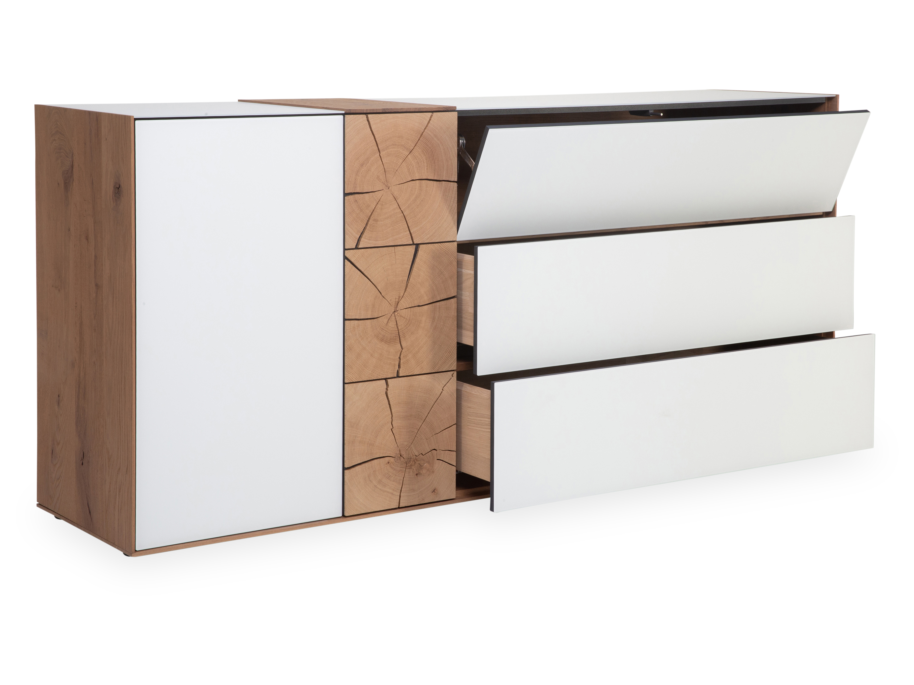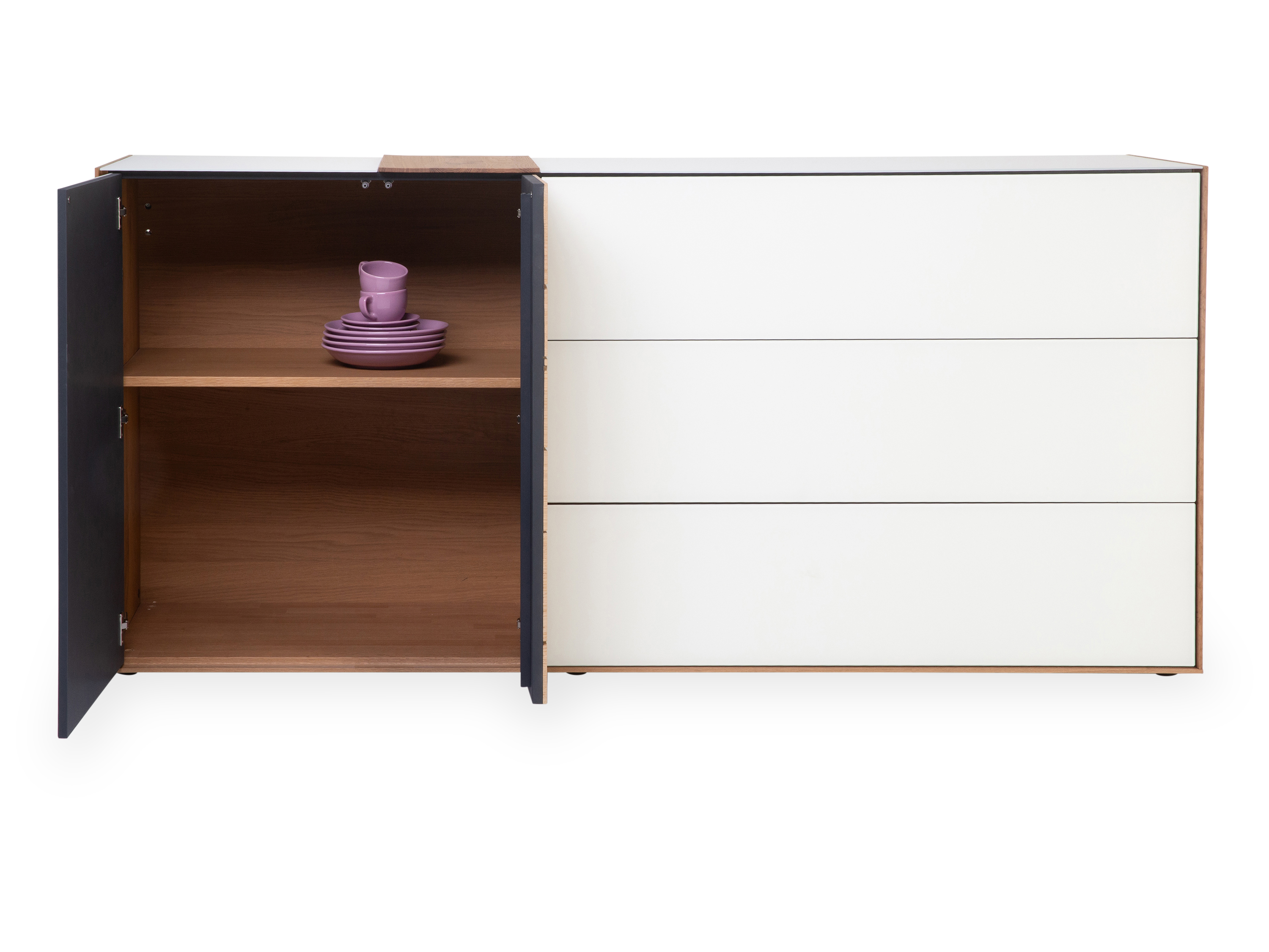 · mit einer Tür, zwei Schubkästen, einer Klappe, einer Tür mit Applikation, einem Holzboden und einem Holzeinlegeboden, Caya