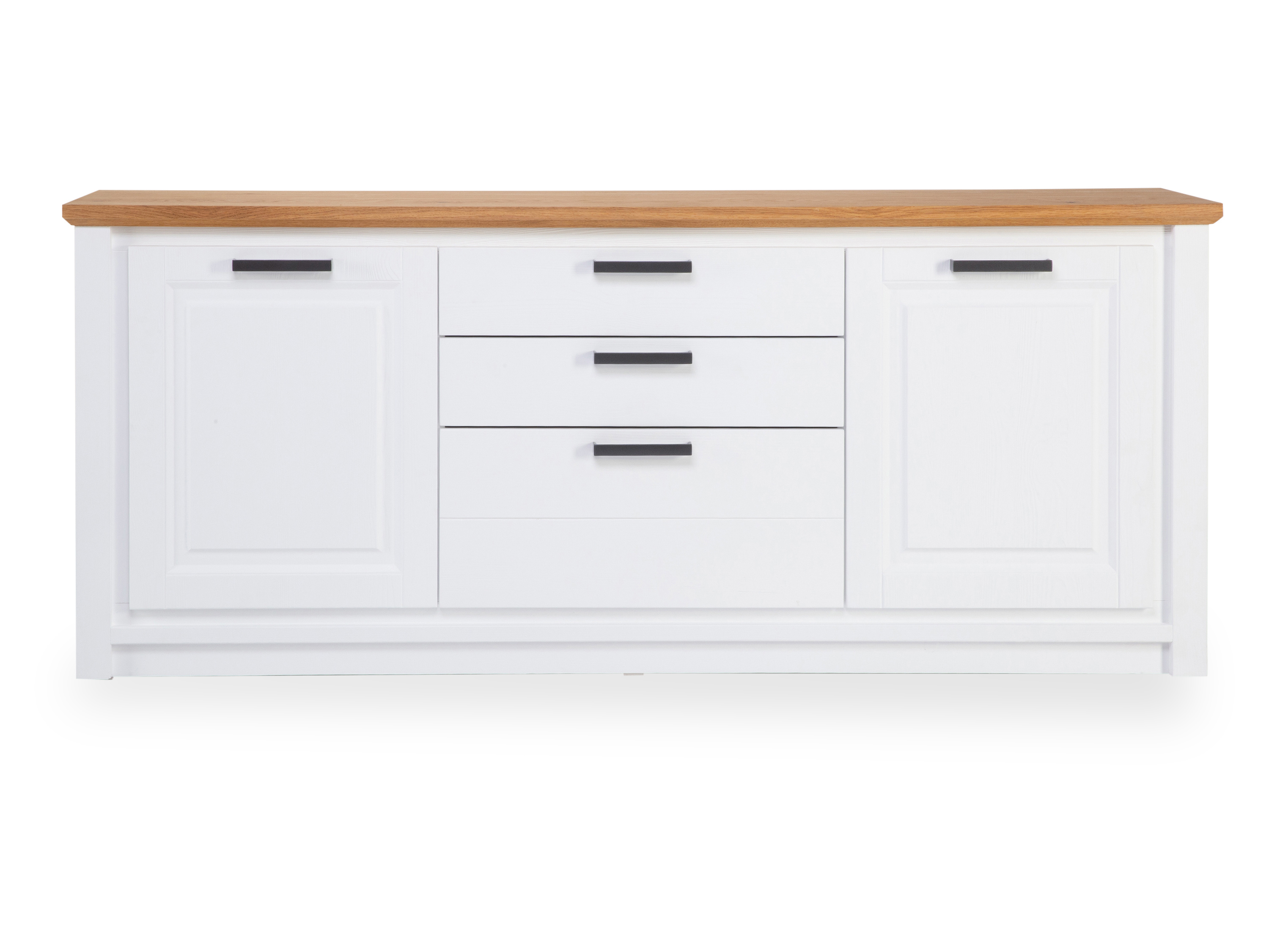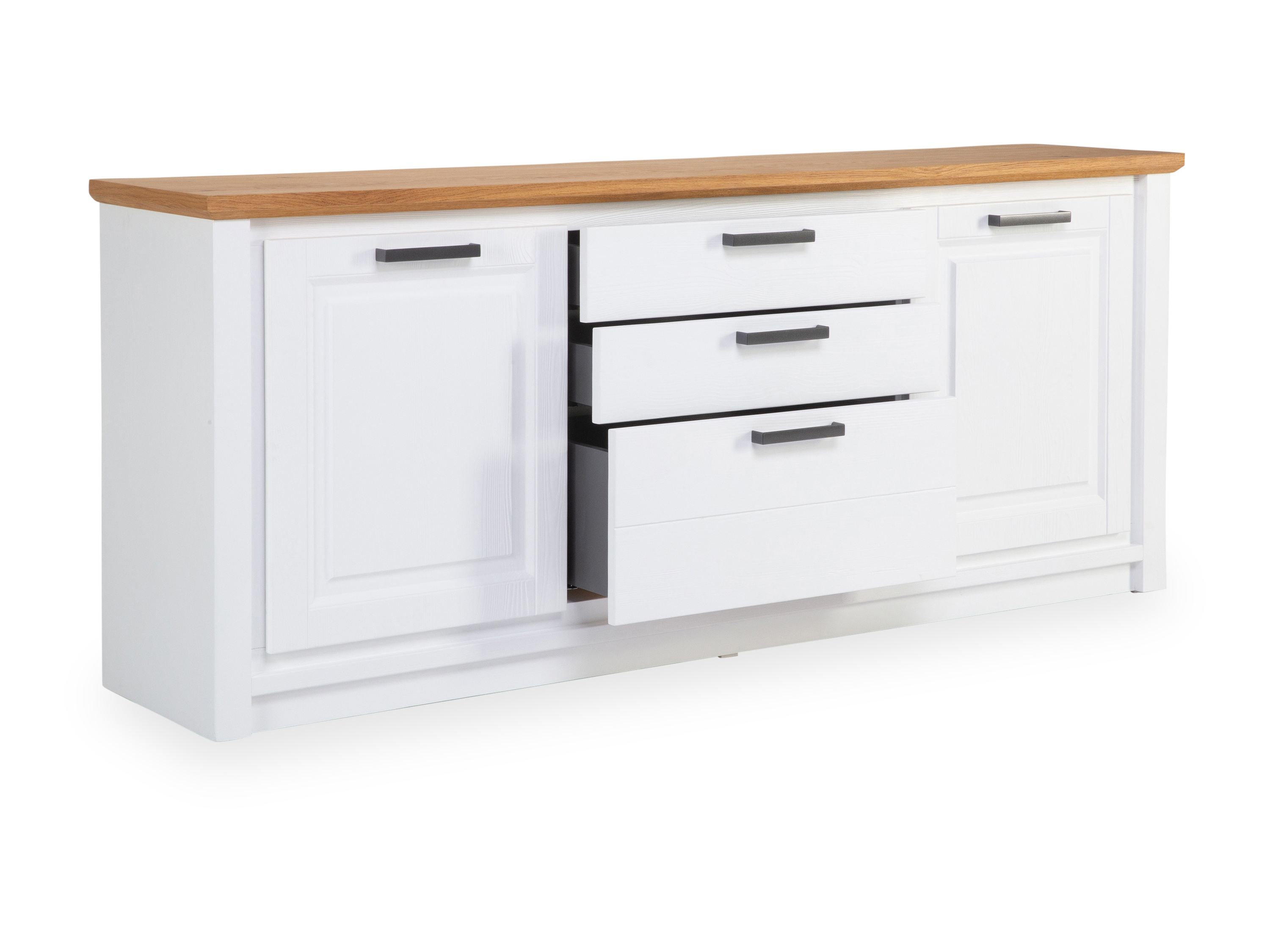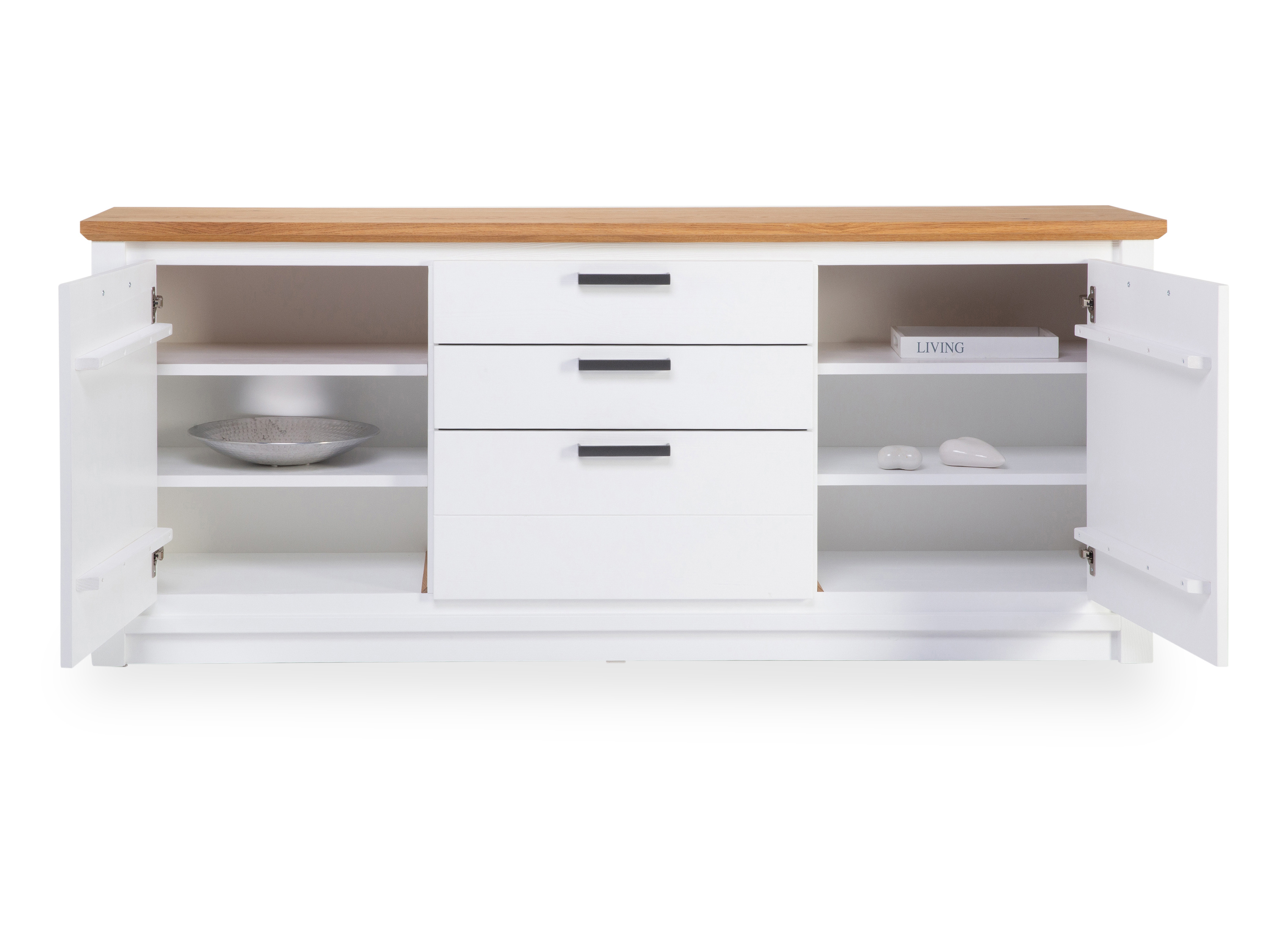 · je eine Holztür links und rechts mit je zwei Einlegeböden, mittig drei Schubkästen, Thuxon