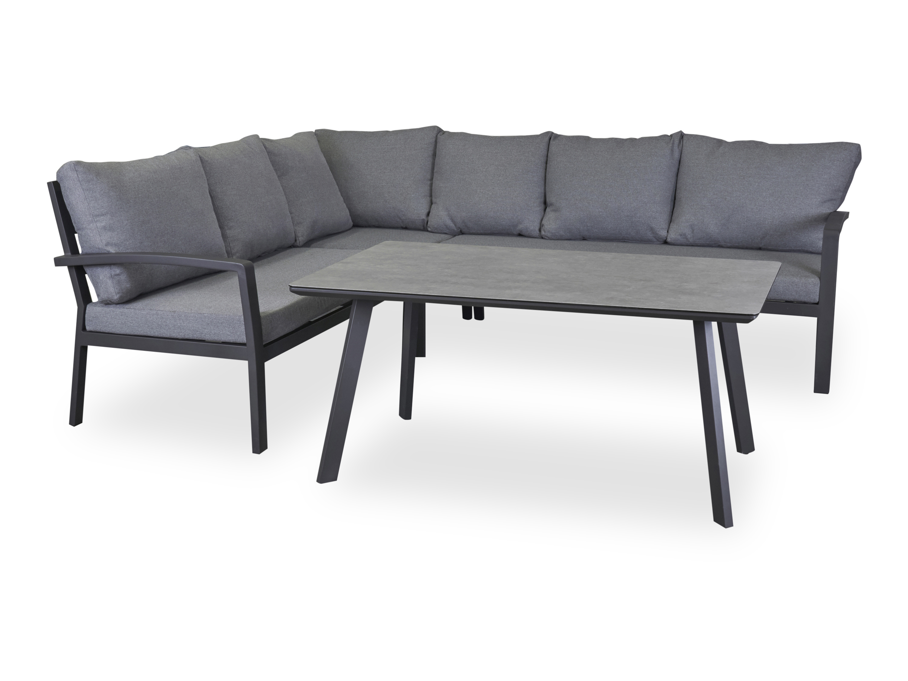 · bestehend aus: 1x Eckelement, 82x82x88 cm mit Kissen in hellgrau 1x 2er Sofa mit Kissen in hellgrau 1x 3er Sofa mit Kissen in hellgrau Kissenstärke: ca 10 cm 1x Tisch, 140x65x80 Tischplatte: Glas mit Keramik- Beschichtung in Betonoptik