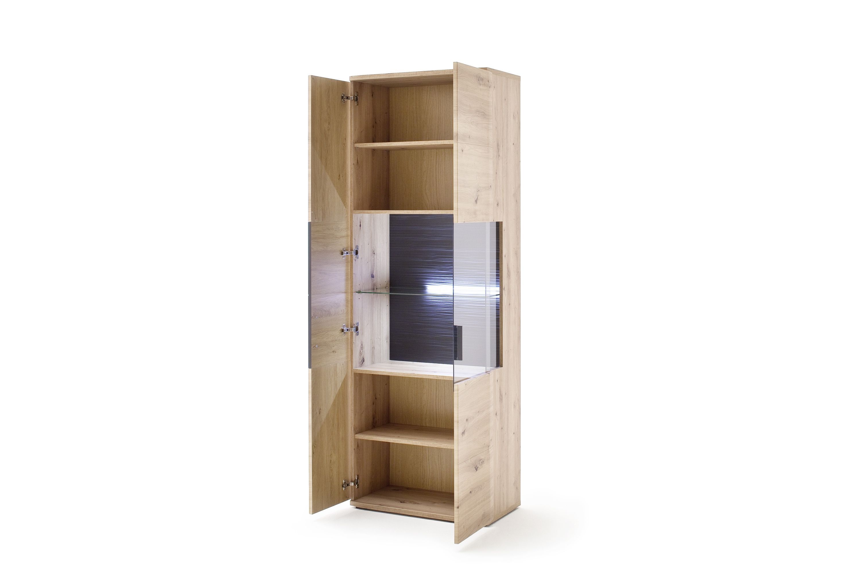 Genießen Sie die perfekte Verbindung von modernem Stil und durchdachter Funktionalität und machen Sie die Vitrine MADANG von HARPER zu einem Highlight in Ihrem Zuhause. Die stilvolle Vitrine besticht durch ihre Front und den Korpus aus Balkeneiche Nachbildung, das jedem Raum eine natürliche Ausstrahlung verleiht. Die anthrazit geschroppte, sichtbare Rückwand setzt einen modernen Akzent und harmoniert hervorragend mit der Rückwand aus Eichen Nachbildung. Die Vitrine verfügt über eine Tür und eine weitere Tür mit Glaseinsatz, die beide gedämpft sind und somit sanftes und leises Schließen ermöglichen. Das elegante Parsol-Grau des Frontglases rundet das eindrucksvolle Erscheinungsbild gekonnt ab und ermöglicht eine dezente Präsentation Ihrer Lieblingsstücke. Die Vitrine MADANG lässt sich harmonisch in moderne Einrichtungskonzepte integrieren.