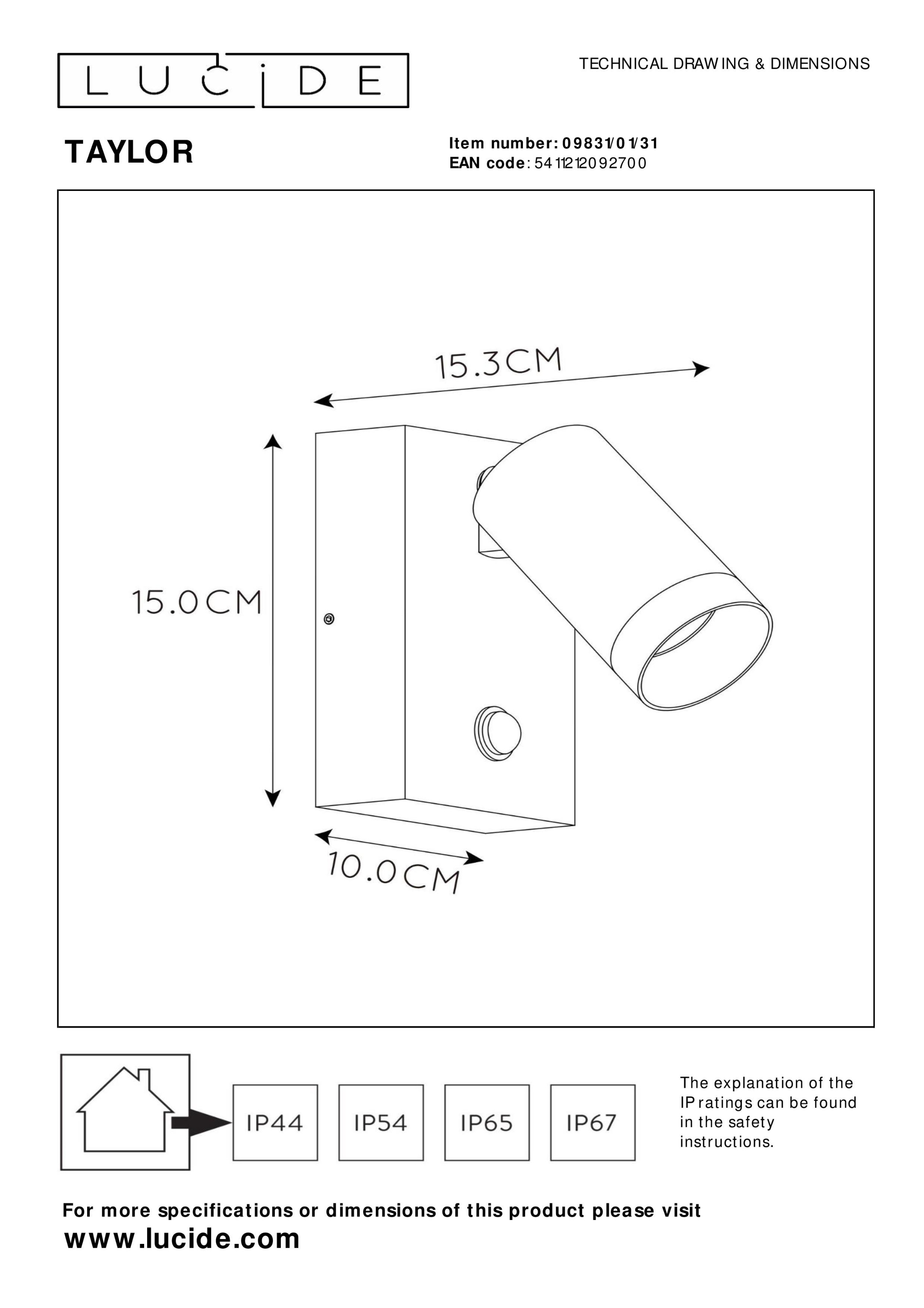 Im Dunkeln erleuchtet die Wandlampe TAYLOR Ihren Weg. Holen Sie sich mit dieser Leuchte die Qualität der Marke LUCiDE nach Hause. Das Modell TAYLOR besitzt die Schutzart IP54 und ist aufgrund dessen staubgeschützt und vor Spritzwasser sicher. Es zeigt sich in einem hübschen Stil und fügt sich wirkungsvoll in jeden Raum ein. Die Möglichkeit zum Dimmen sorgt für flexible Lichtverhältnisse und eine behagliche Wohlfühlatmosphäre. Die Lampe weist eine Höhenabmessung von insgesamt 15 Zentimetern, eine Breite von 15,3 Zentimetern und eine Länge von 10 Zentimetern auf. Die Leuchte aus Aluminium kann auch optisch durch ihr modernes Design begeistern. Das Modell TAYLOR ist mit einer GU10-Fassung ausgestattet. Es integriert sich perfekt in jedes Zimmer und kreiert ein hervorragendes Ambiente. Die Lampe ist eine stilvolle Möglichkeit, Ihren Wohnraum zu beleuchten, und somit eine ausgezeichnete Wahl. Ergänzen Sie das Gesamtbild Ihres Zuhauses mit dieser tollen Leuchte.